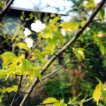 この品種は、オオシマザクラの自然交雑実生から選抜して育成されたものであり、花は一重咲、黄白色の中輪で、成葉の表面が鮮黄緑色の切り枝及び鉢物向きの品種である。樹形は傘状、樹高は亜高木性である。樹幹の色は灰褐色、皮目は中、枝の太さは太、色は灰褐色、分枝性は中である。葉全体の形は楕円形、先端の形は尾形鋭尖形、基部の形は円形、葉縁(鋸歯)の状態は中、鋸歯の形は二重鋸歯、先端は芒形、葉の長さ及び幅は中、厚さは厚、若芽の色は濃黄(JHS カラーチャート2508)、成葉の表面の色は鮮黄緑(同3306)、蜜腺の有無は有、位置は葉柄上部である。花序の形は散房状、花数は中である。蕾の色はピンク白(同9701)、花の向きは横向き、形は一重咲、開き方は平開形、大きさは中輪、花の色は黄白(同2901)、花弁全体の形は楕円形、花弁の切れ込みは少、基部の形は鈍形、花弁の脈の色は目立たない、数は約5である。雌ずいと雄ずいの長さの比は長、雄ずいの数は中、がく筒の形は盤状形以外、盤状形以外のがく筒の形は長鐘形、がく筒の毛は無、がく裂片の形は披針形、花柄の長さは中である。花の香りは少し有、通常開花期は中で、育成地(茨城県真壁郡関城町)では4月上旬~中旬である。オオシマザクラと比較して、若芽の色が濃黄であること、成葉の表面の色が鮮黄緑であること等で区別性が認められる。 |