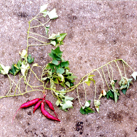 この品種は、「ベニアズマ」に「九州30号」を交配して育成されたものであり、草型は匍匐型で、葉は単欠刻浅裂、いもの皮色は赤、肉色が黄白の電子レンジ調理が可能な青果向きの品種である。草型は匍匐型、草勢は中、巻つる性は無、草高は中、茎色及び節色は無、茎の太さ、茎長、分枝数及び節間長は中、茎の毛茸は少、頂葉色の最優性色は緑、副次的色は無、葉色は緑、葉形は単欠刻浅裂、葉の大小はやや大、葉脈色及び蜜腺色は無、藷梗の長さは短、強さはやや強、いもの形状は長紡錘形、大小は大、皮色の基本色は赤、補助色は紫、皮色の濃淡はやや濃、分布は均一、肉色は黄白、条溝は微、皮脈は無、外観はやや上、不和合群はA群、萌芽伸長の遅速は早、萌芽の多少及びアール当たり上いも重はやや多、カロチンの多少は無、黒斑病抵抗性は中、ネコブセンチュウ抵抗性はやや強である。「ベニアズマ」と比較して、葉形が単欠刻浅裂であること、蜜腺色が無いこと等で、「高系14号」と比較して、葉形が単欠刻浅裂であること、不和合群がA群であること、ネコブセンチュウ抵抗性が強いこと等で区別性が認められる。 |