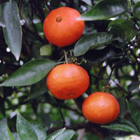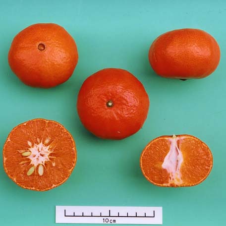 この品種は、「林温州・福原オレンジNo.9」に「アンコール」を交配して育成されたものであり、果形が扁球、果実の重さがやや重、果皮色が橙赤の育成地(長崎県南島原市)では12月中旬に成熟するかんきつである。樹姿は中間、樹の大きさ及び樹勢は中である。枝梢の太さ、節間長及びとげの多少は中である。葉身の形は卵形、波状の程度は無、葉身の大きさ及び葉身長は中、葉身幅はやや狭、網脈の鮮明度はやや明瞭である。翼葉の形は痕跡、葉柄の長さは短、太さは中である。花序の形成は単生、花(花蕾)の重さは軽、花弁の形は紡錘形、長さは短、幅は広、色は白、数は5枚、花糸の分離の程度は分離、花粉の多少は中である。果実の形は扁球、果形指数はやや大、果頂部の形は平坦、放射条溝及び凹環の有無は無、果梗部の形は球面、放射条溝の多少は少である。果心の充実度は中、大きさは極小、果実の重さはやや重、果皮の色は橙赤、油胞の大きさは小、密度は中、凹凸は平、果面の粗滑は滑、果皮の厚さはやや薄、果皮歩合はかなり小、剥皮の難易は中である。じょうのう膜の硬さは軟、さじょうの形は細長、大きさは中、色は濃橙である。果汁の多少は中、甘味は高、酸味は中、香気の多少は多、種子数は中、胚の数は単胚である。発芽期は中、開花期は晩、成熟期はかなり早で育成地においては12月中旬である。隔年結果性は中、浮皮果の発生は無、裂果の発生は中である。「麗紅」と比較して、果実の形が扁球であること、果心が小さいこと等で、「マーコット」と比較して、果実が重いこと、成熟期が早いこと等で区別性が認められる。 |