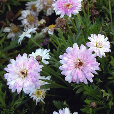 株の草型は中、高さは短である。茎の太さは中、アントシアニンの発色は無、一次分枝数は中、節間長は短である。葉序は2/8、葉片の幅及び欠刻の深さは中、葉縁の鋸歯の形は深鋭鋸歯、粗密は粗、葉身長は短、幅は中、葉身の色は緑、葉柄の長さは中、葉の角度は斜上である。花房の形は凹型、花数は多、花形は八重、花容は垂下、花径は小 、舌状花の長さは短、幅は狭、形は倒卵形、先端の形は波状形、数は極多、表面及び裏面の色は黄白(JHS カラーチャート2901)、複色は有、色は淡紫ピンク(同9502)、花中央部の色は緑、花の臭気は有、芳香は無である。開花期は中である。「サマーメロディー」と比較して、花容が垂下であること、舌状花表面の色が黄白であること、花中央部の色が緑であること等で、「モモコ」と比較して、葉縁の鋸歯の形が深鋭鋸歯であること、舌状花表面の色が黄白であること、花中央部の色が緑であること等で区別性が認められる。 |