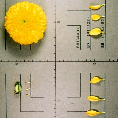 開花時の草丈は低、節間長はかなり短、茎の太さは中、茎の色は緑、たく葉の大きさはかなり小、葉の着き方(着生方向)は上向き、葉長は中、葉幅はやや広、葉の縦横比はやや小、葉の光沢は中、葉の一次欠刻の深さは中、葉基部の形は平形、葉表面の色は淡、花房の形(スプレイぎくに限る)は円錐形、花の数(スプレイぎくに限る)はやや少、舌状花の重ね(一重・八重の別)は八重、花の大きさ(スプレイぎく)は小、花の厚み(スプレイぎく)はやや薄、花首の長さは中、花たくの形は盛り上がったドーム状、舌状花の多少(露心する八重品種及び八重品種に限る)はやや多、舌状花の向きは下垂(-30度以下)、舌状花の主要な形は樋弁、舌状花の花筒部の長さはやや短、舌状花の最大部の横断面の形(管弁品種は除く)は凹、外花弁の長さは短、外花弁の最大幅は狭、花弁先端の形は丸、舌状花の表面の色の分布状態は均一、外花弁の表面の色は5B、外花弁の裏面の色は5C、内花弁の表面の色(露心する八重品種・八重品種に限る)は5B、内花弁の裏面の色(露心する八重品種・八重品種に限る)は3C、管状花の花冠の深裂の程度(アネモネ品種を除く)は小、管状花の長さ(開葯時)は中、生態分類型は秋、到花週数(周年生産品種に限る)は7.0週である。(カラーチャートはRHSを使用) 出願品種「セレーニティエラ」は、対照品種「カイマン」と比較して、開花時の草丈が低であること、舌状花の主要な形が樋弁であること等で区別性が認められる。