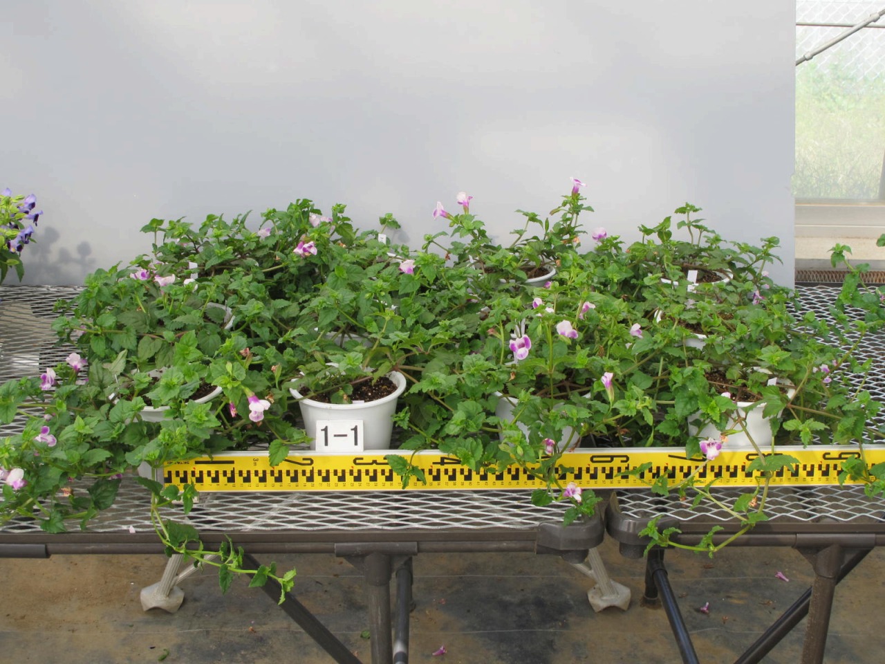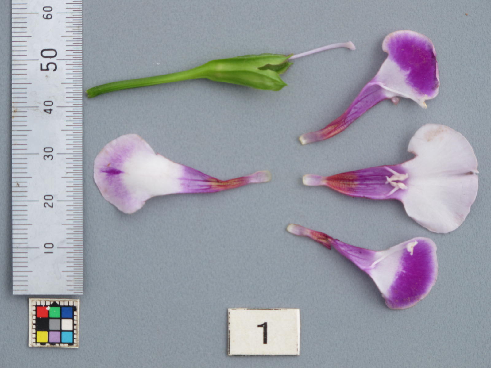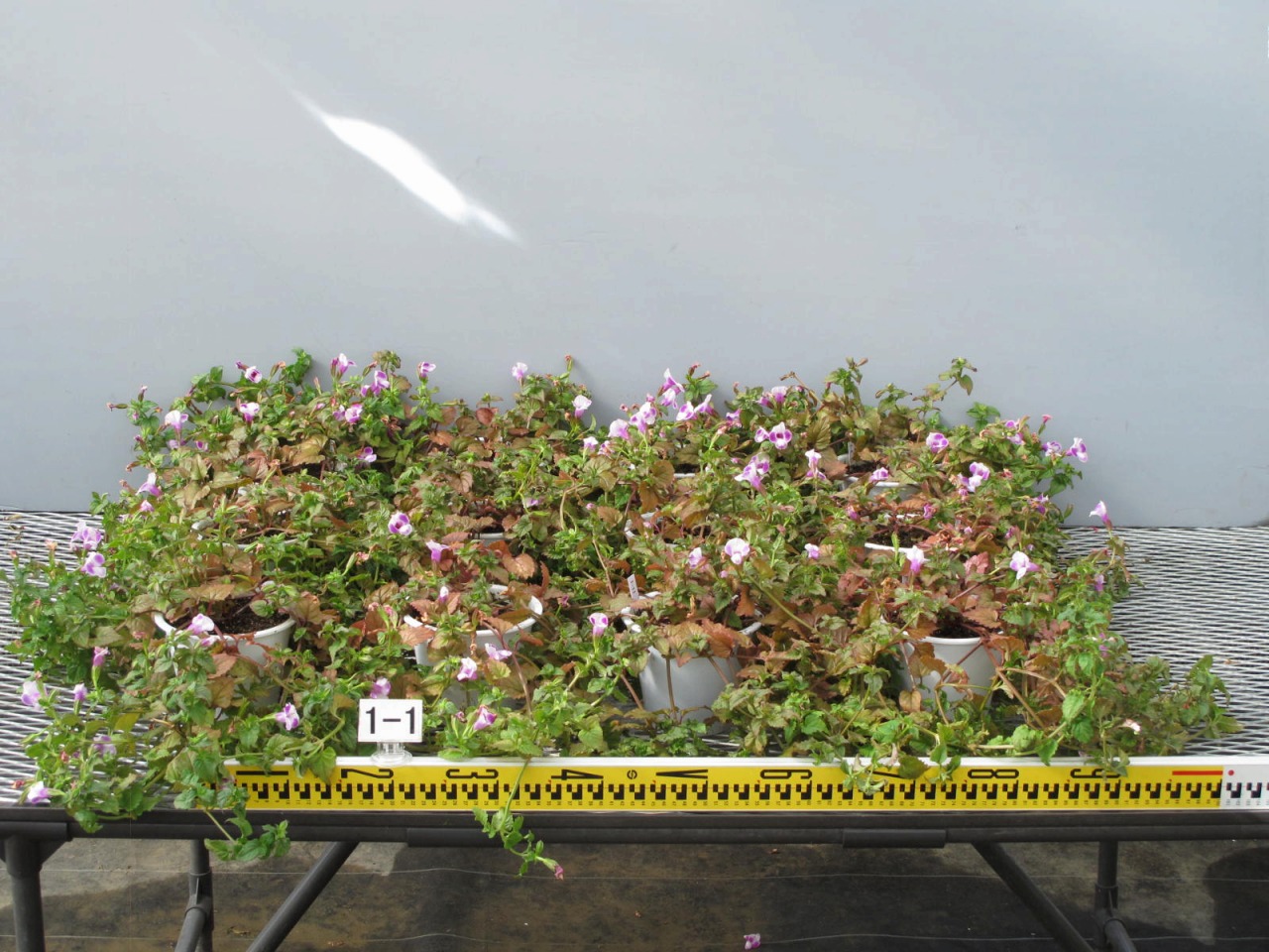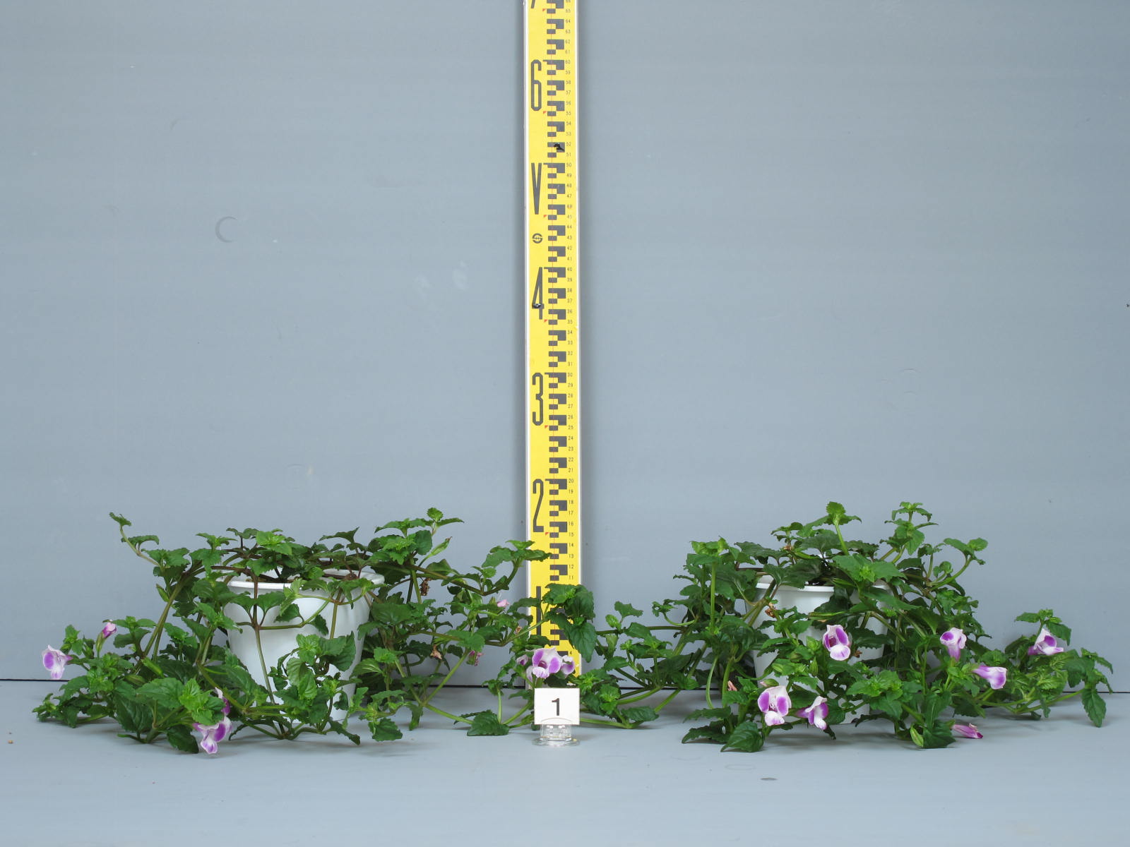 草型はほふく性、草丈は低、茎の太さはかなり太、茎(節部)のアントシアンの発色は濃、茎の毛の多少はやや少、分枝性は中、節間長は長、葉の形は広卵形、葉長は長、葉幅は広、葉柄の太さは太、葉柄の長さは中、花序はえき性、花形は丸形、花径(縦)はやや長、花径(横)は長、花筒長は中、上唇弁の色は84D、下唇弁(側弁)の色はN80A;84D、下唇弁(下弁)の色はN80A;N78C;84D、筒部の色はN80A、唇弁の花色のパターンはその他のパターン、ブロッチの有無は無、上唇弁の波打ちの程度は中、がくの切れ込みの形は深く2裂、がくの長さは中、雄ずいのアントシアンの発色は淡、雄ずいの距の有無は有、花柄の太さはかなり太、花柄の長さはやや短、花穂形成の有無は無である。(カラーチャートはRHSを使用)