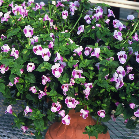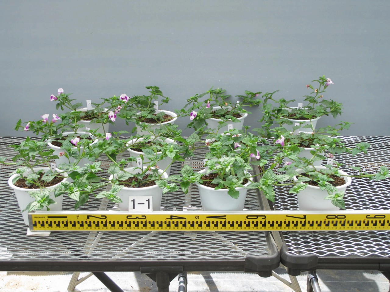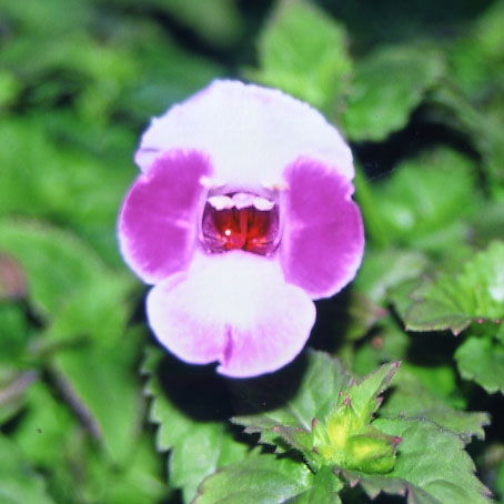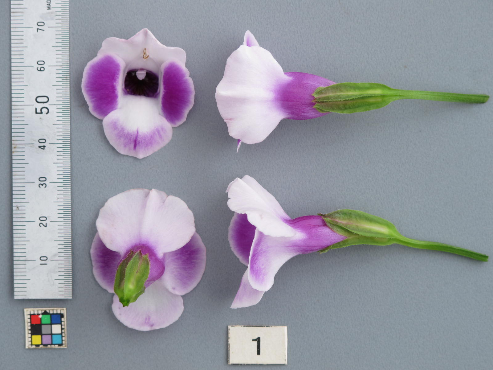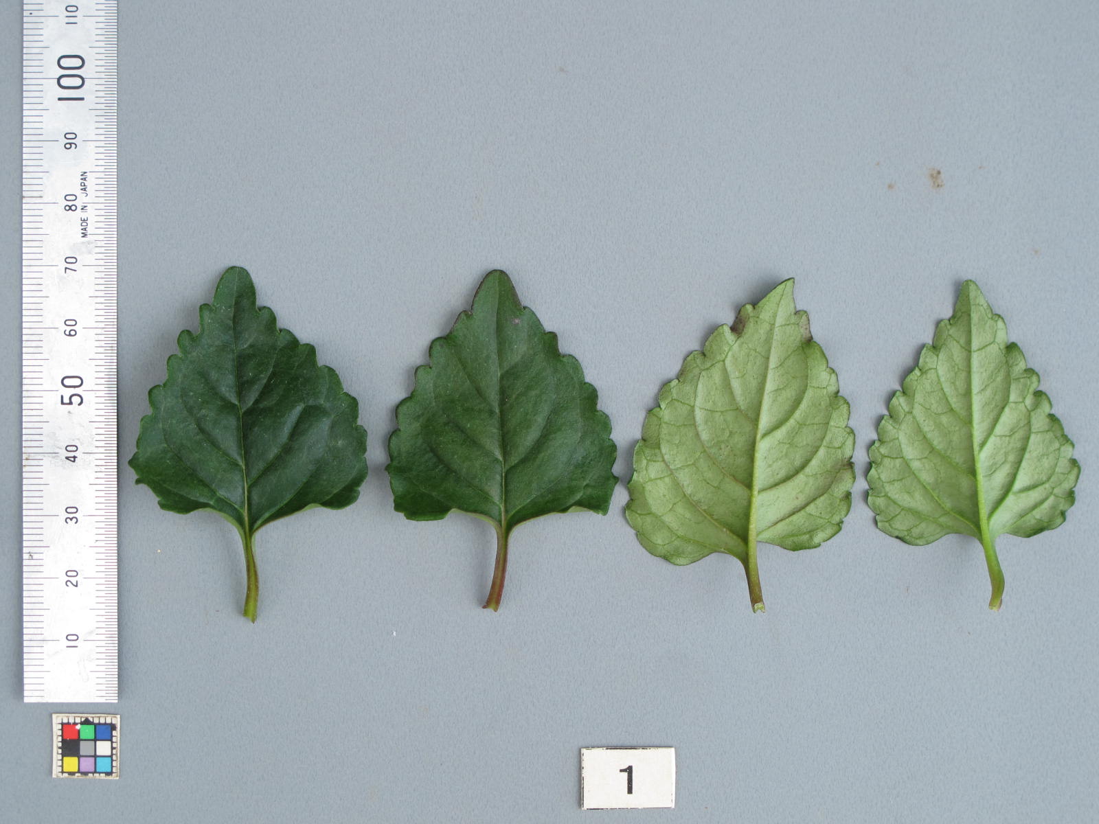 草型はほふく性、草丈は低、茎の太さはかなり太、茎(節部)のアントシアンの発色は濃、茎の毛の多少はやや少、分枝性は中、節間長は長、葉の形は広卵形、葉長は長、葉幅は広、葉柄の太さは太、葉柄の長さは中、花序はえき性、花形は丸形、花径(縦)はやや長、花径(横)は長、花筒長は中、上唇弁の色は84D、下唇弁(側弁)の色はN80A;84D、下唇弁(下弁)の色はN80A;N78C;84D、筒部の色はN80A、唇弁の花色のパターンはその他のパターン、ブロッチの有無は無、上唇弁の波打ちの程度は中、がくの切れ込みの形は深く2裂、がくの長さは中、雄ずいのアントシアンの発色は淡、雄ずいの距の有無は有、花柄の太さはかなり太、花柄の長さはやや短、花穂形成の有無は無である。(カラーチャートはRHSを使用)