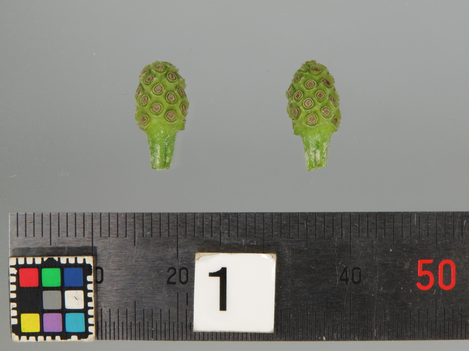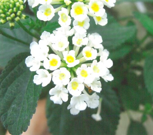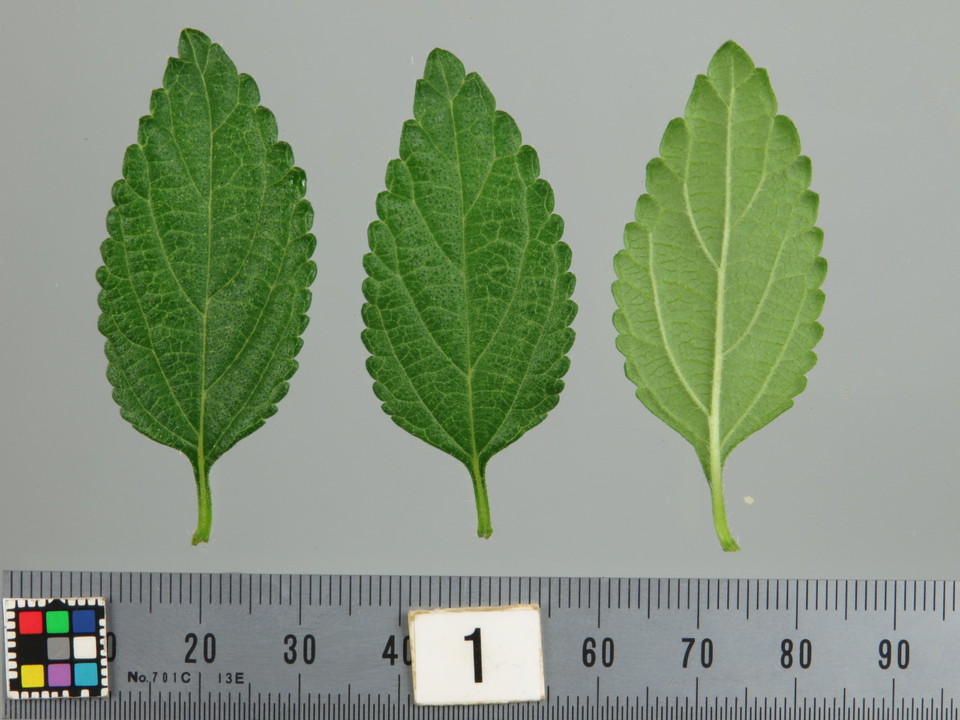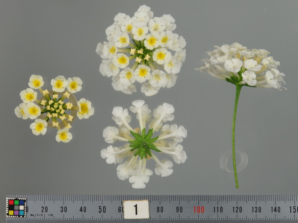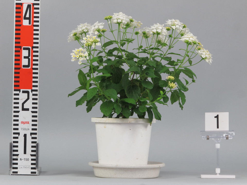 樹姿は直立型、樹高はやや低、株張りはかなり小、枝の長さは短、枝の太さは細、枝の色は緑色、枝のとげの有無は無、稜の有無は無、分枝性は多、節間長は短、葉の形は卵形、葉身長はやや短、葉幅はやや狭、葉長比はやや大、葉のつき方は対生、葉の表面の色は濃緑、葉の斑入りは無、葉の表面の毛の多少は少、葉の表面の毛の硬さは硬、葉柄長は中、花房の形は平たい球形、花房径はかなり広、花の直径はやや小、花筒の長さはやや長、花色の変化の有無は無、満開時の花色はNN155C、小花の中心部の色の変化は有、開花始めの小花の中心部の色は6A、満開時の小花の中心部の色はNN155C、ほう葉の形は線状披針形、花柄の長さは中、一花房当たりの開花数は中、花の香りはかなり弱、果実の着生の難易は極難、開花習性は四季咲き、開花時期はやや晩である。(カラーチャートはRHSを使用)