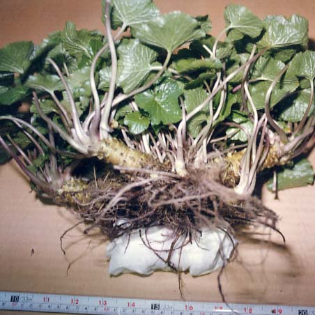 この品種は,「だるま系」及び「真妻系」の混植わさび田より変異株を発見,増殖 した固定品種であり,軟腐病及びすみ入り病に強い水わさびである。 草姿は極開,草丈はかなり低である。葉形は丸,葉色はかなり濃緑,主茎展開葉数 はやや少,1株総展開葉数はやや少,葉面の光沢は極多,展葉の早晩はかなり晩であ る。葉柄の長さはかなり短,基部の幅はかなり狭,色は濃緑,アントシアニンの有無 は有,多少はやや少である。根茎の形は中太,太さは中,長さは長,表皮の色は濃緑, 根茎の表皮のアントシアニンの有無は無,横断面のアントシアニン着色の有無は無で ある。根径の肥大の早晩は晩,根茎の辛味の程度は強,葉柄の辛味の程度は中,根茎 のすりおろし時の色は緑,香気の程度は強,甘味及び粘りの程度はやや強である。分 げつ性は多,耐高温性は強である。軟腐病及びすみ入り病抵抗性は強,白さび病抵抗 性は強である。 「真妻」と比較して,主茎展開葉数が少ないこと,根茎表皮のアン トシアニンの 有無が無であること,根数が多いこと,分げつ性が多いこと等で,「だるま」と比較 して,草姿が開であること,根茎表皮のアントシアニンの有無が無であること,甘味 及び粘りの程度が強いこと等で区別性が認められる。 |