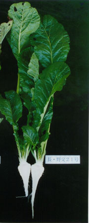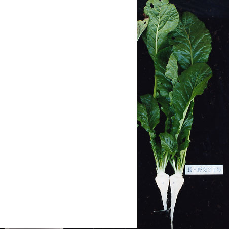 この品種は,「野沢菜」と欧州系かぶを育種素材として育成した系統を母系とし,「野沢菜」の選抜系統を父系とする交雑品種であり,草姿は立性で草丈は高く,葉は淡緑色で葉縁の切れ込みは浅く,アントシアニンによる葉面の着色がない漬物用品種である。草姿は立,草丈は高,子葉の大きさは中,色は緑,胚軸の色は淡緑,分げつ性は無である。葉数は中,葉形は倒披針,葉長はかなり長,葉縁の切れ込みは浅裂,葉色は淡緑,葉面の着色は無,葉のろう質は少,葉面の毛じは無,波うちはかなり少,葉柄・中肋の形は半円状,幅は中,色は淡緑である。種子の色は茶,早晩性及び抽だい性は中である。「野沢菜」と比較して,葉面の着色がないこと,葉面の波うちが少ないこと等で,「野沢菜信濃」と比較して,葉長が長いこと,葉色が淡いこと等で区別性が認められる。 |