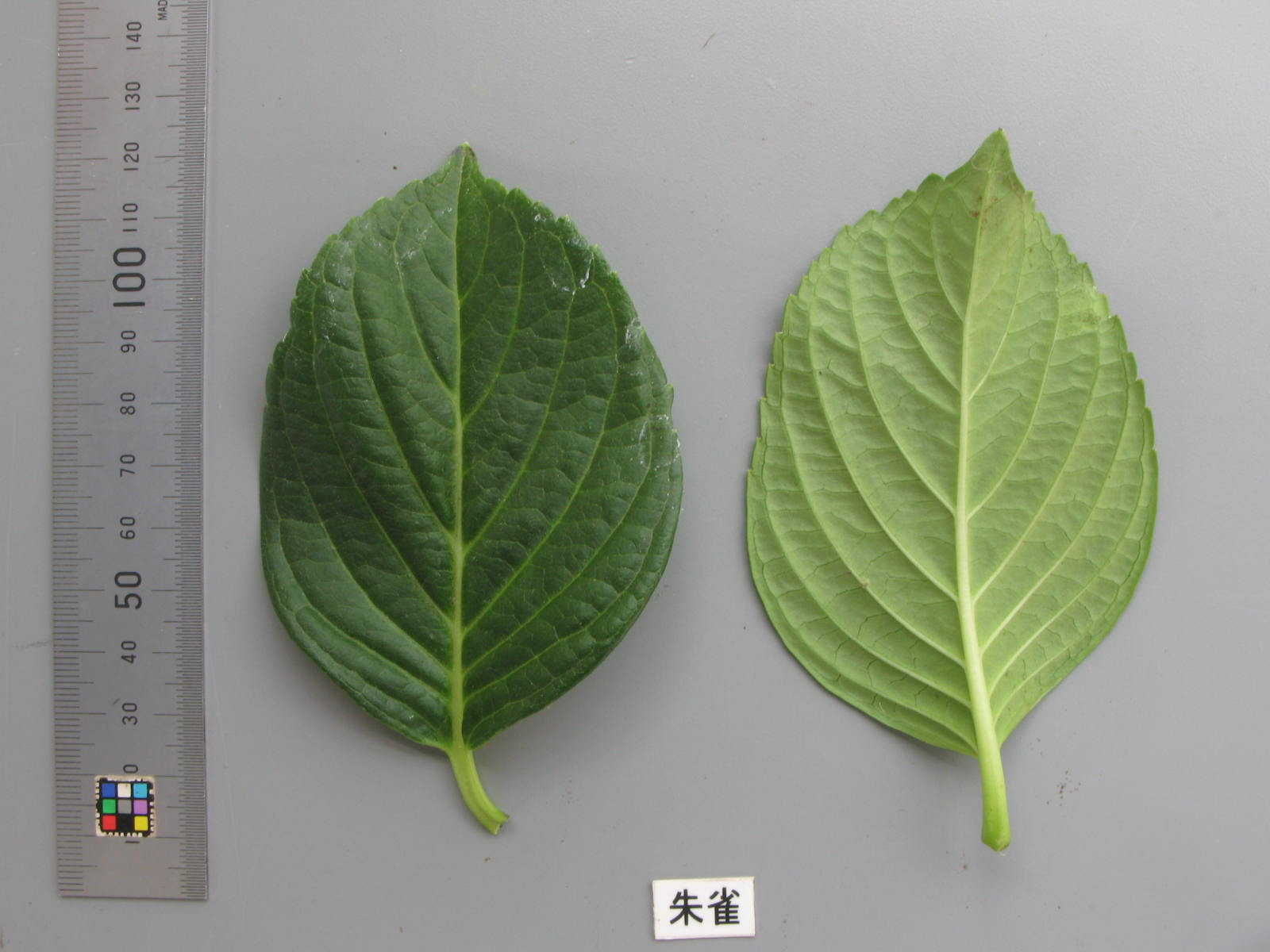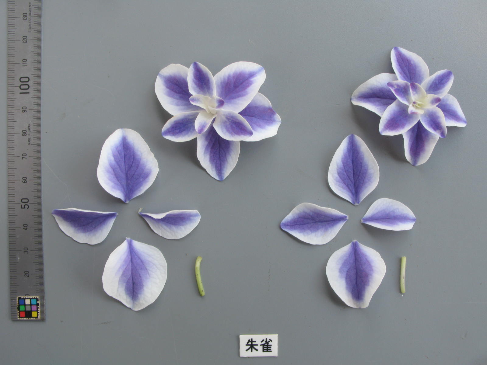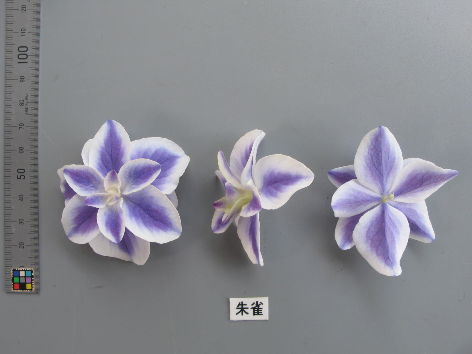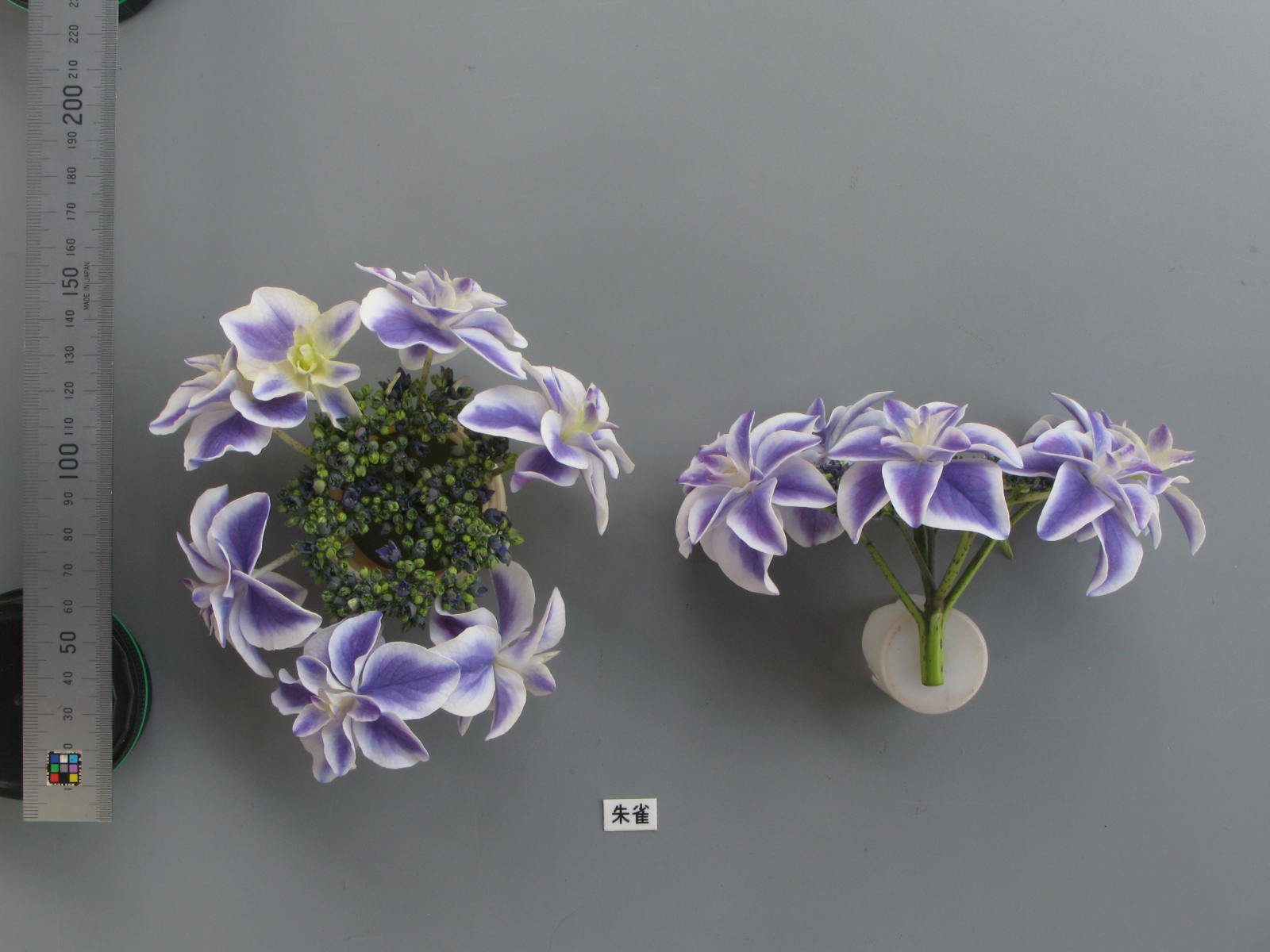 特性は別紙のとおり。 出願品種「朱雀」は、対照品種「コンペスマイル」と比較して、樹高が高であること、装飾花のがく片の横断面の形がやや凹であること等で区別性が認められる。対照品種「幻想恋花」と比較して、花序の幅がやや狭であること等で区別性が認められる。