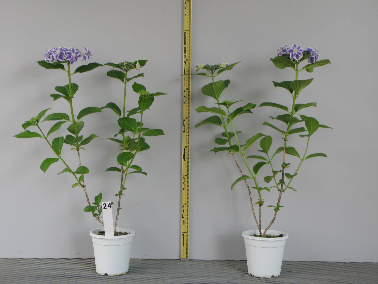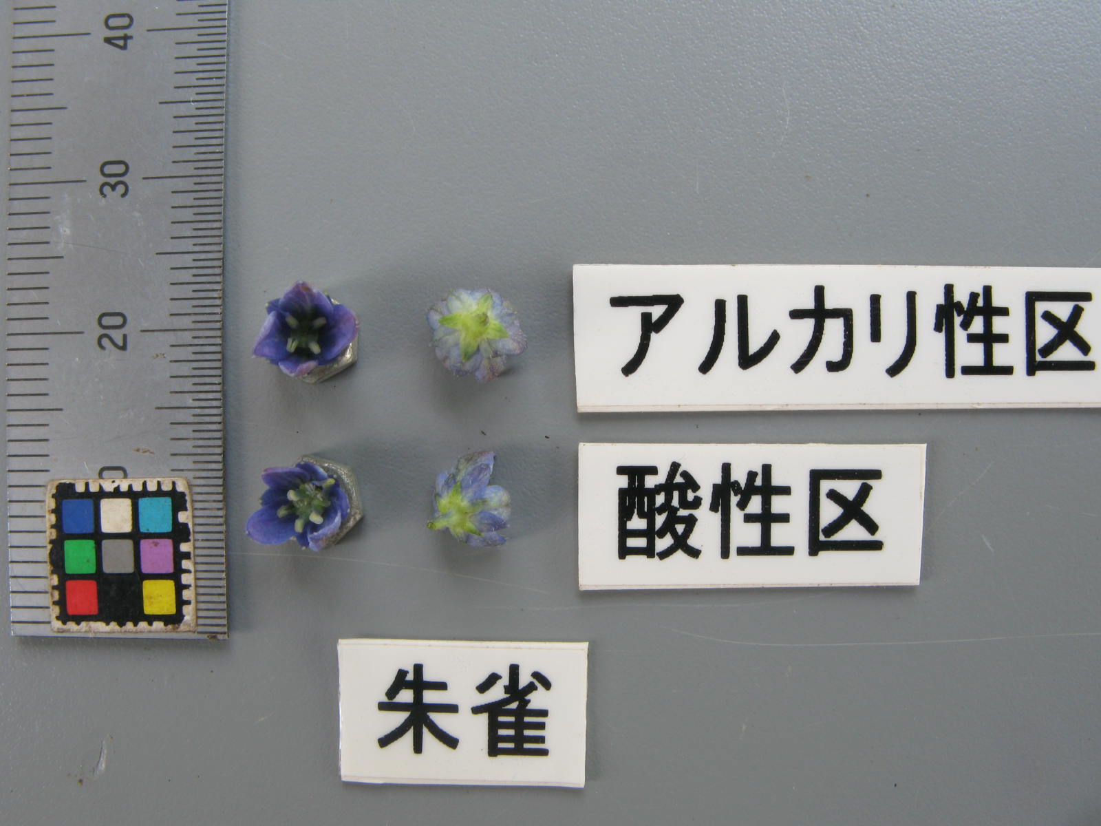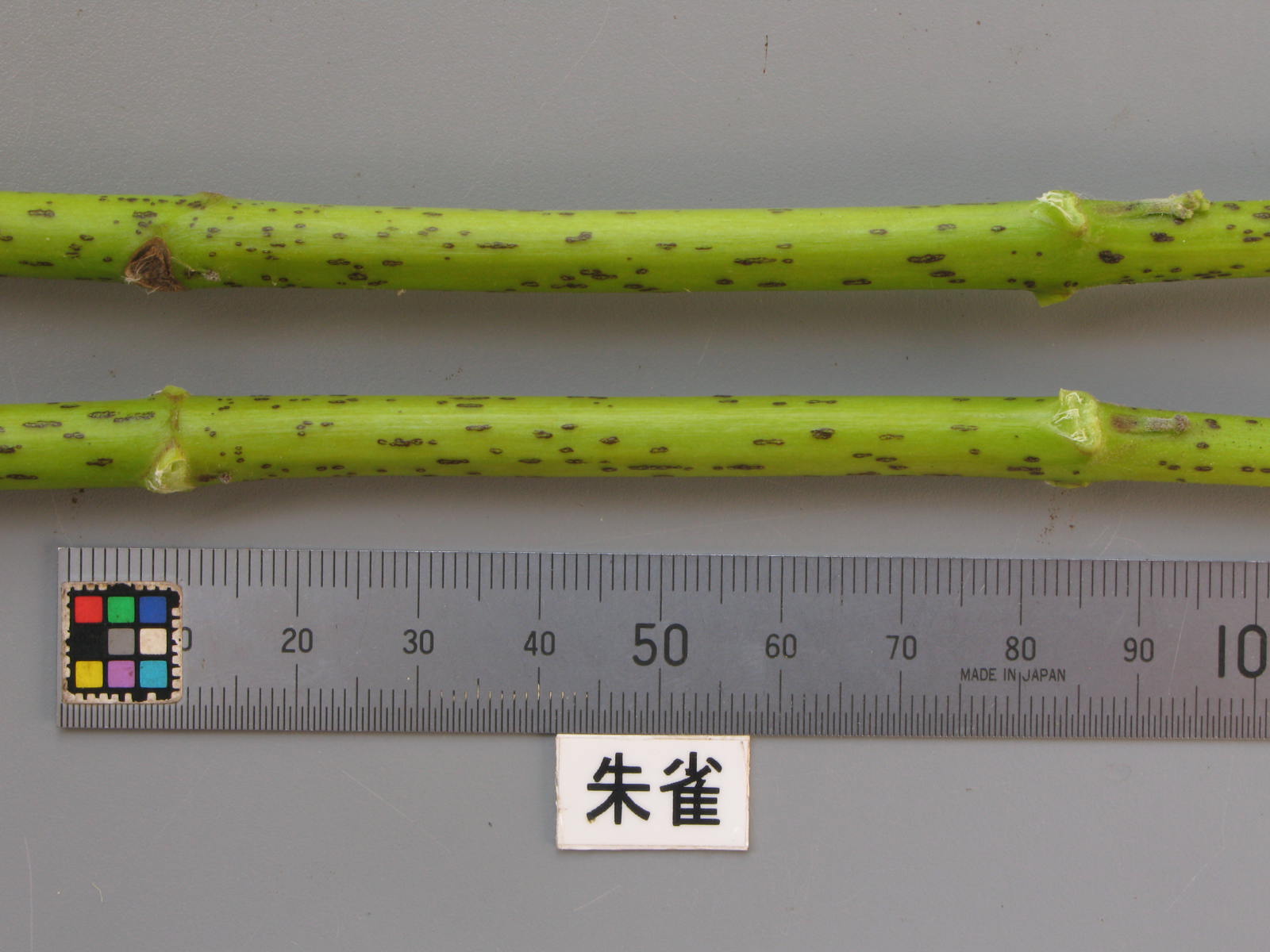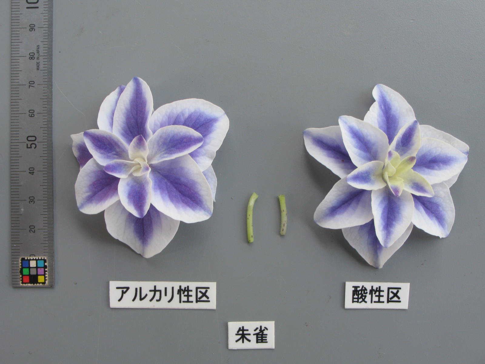 特性は別紙のとおり。 出願品種「朱雀」は、対照品種「コンペスマイル」と比較して、樹高が高であること、装飾花のがく片の横断面の形がやや凹であること等で区別性が認められる。対照品種「幻想恋花」と比較して、花序の幅がやや狭であること等で区別性が認められる。